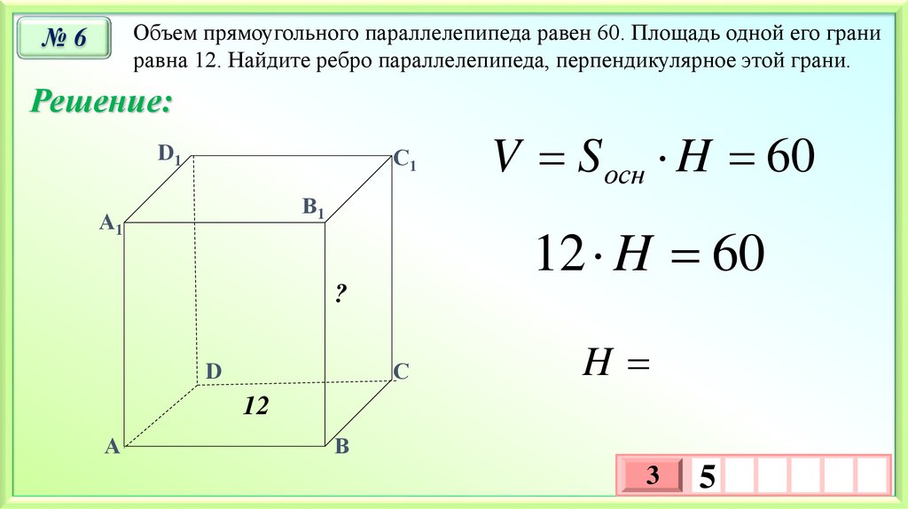 Объем прямоугольного параллелепипеда равен 60. Площадь одной его граниравна 12. Найдите ребро параллелепипеда, перпендикулярное этой грани.