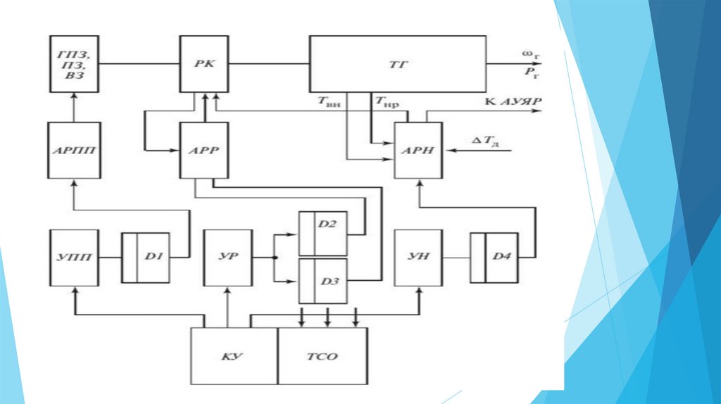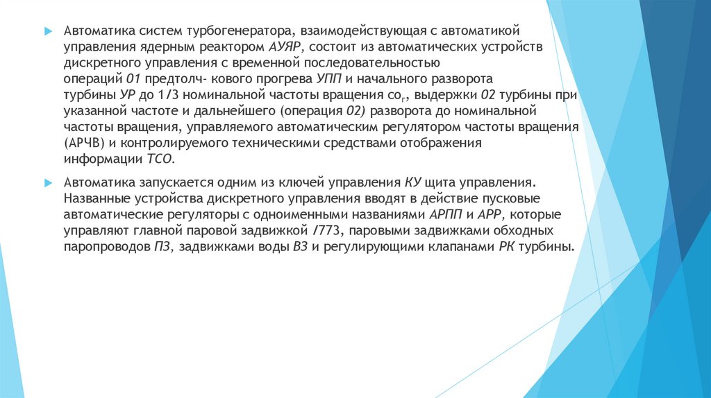 Автоматика систем турбогенератора, взаимодействующая с автоматикойуправления ядерным реактором АУЯР, состоит из автоматических устройств