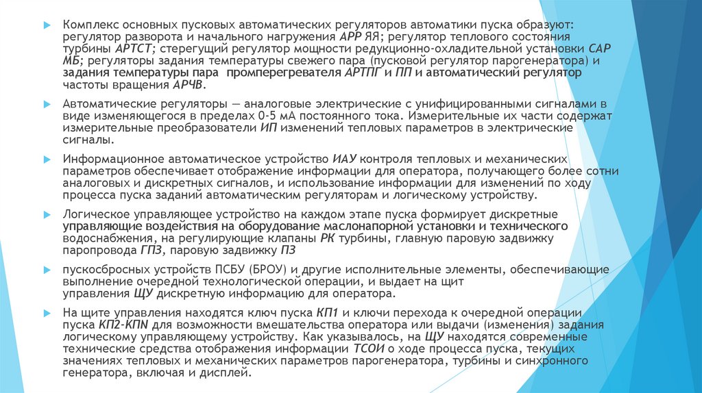 Комплекс основных пусковых автоматических регуляторов автоматики пуска образуют:регулятор разворота и начального нагружения АРР ЯЯ; регулятор теплового состояния