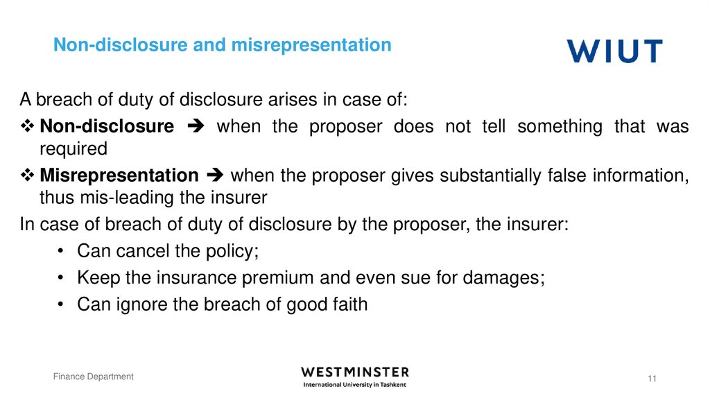 Duty of disclosure implies on each party. It starts at the point of negotiatingthe terms of insurance and end when an insurance contract is formed. It may