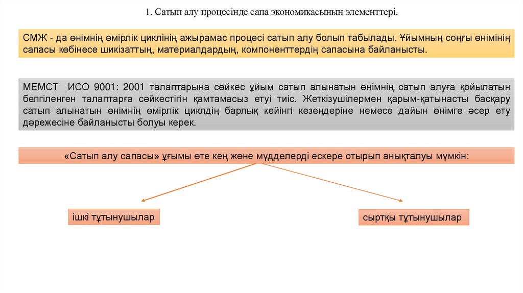1. Сатып алу процесінде сапа экономикасының элементтері.СМЖ - да өнімнің өмірлік циклінің ажырамас процесі сатып алу болып табылады. Ұйымның соңғы өнімінің