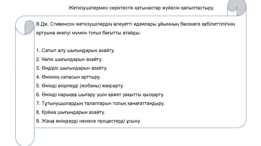 Жеткізушілермен серіктестік қатынастар жүйесін қалыптастыру.В.Дж. Стивенсон жеткізушілердің әлеуетті идеялары ұйымның бәсекеге қабілеттілігінің