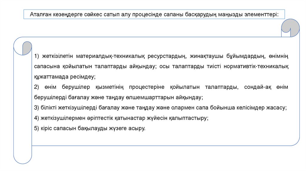 Аталған кезеңдерге сәйкес сатып алу процесінде сапаны басқарудың маңызды элементтері:1) жеткізілетін материалдық-техникалық ресурстардың, жинақтаушы бұйымдардың, өнімнің