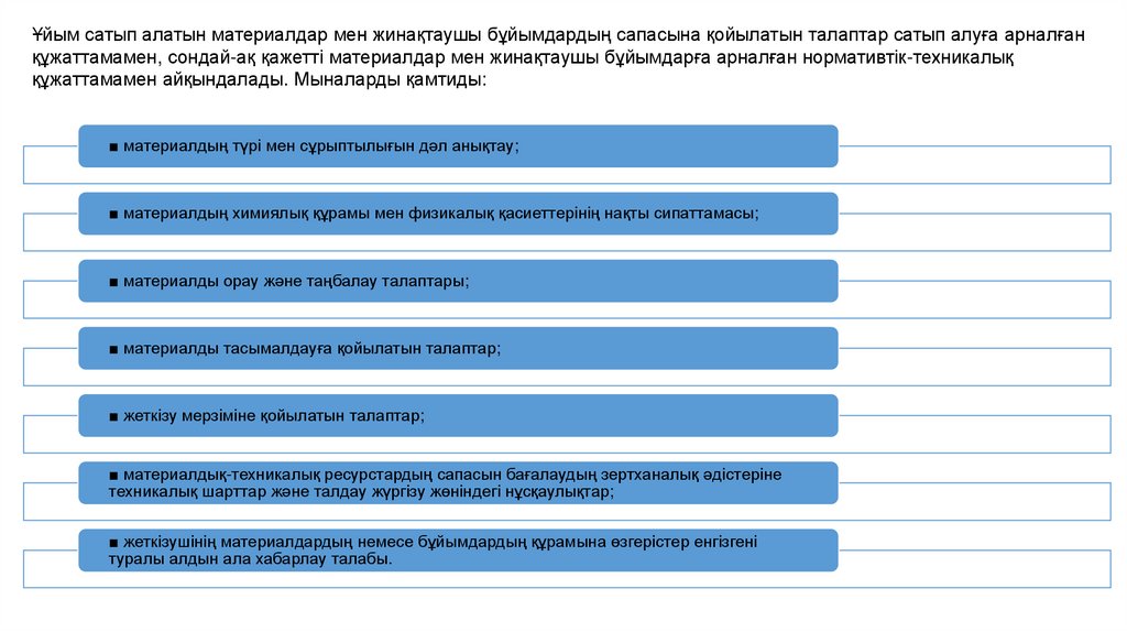 Ұйым сатып алатын материалдар мен жинақтаушы бұйымдардың сапасына қойылатын талаптар сатып алуға арналғанқұжаттамамен, сондай-ақ қажетті материалдар мен жинақтаушы бұйымдарға арналған нормативтік-техникалық