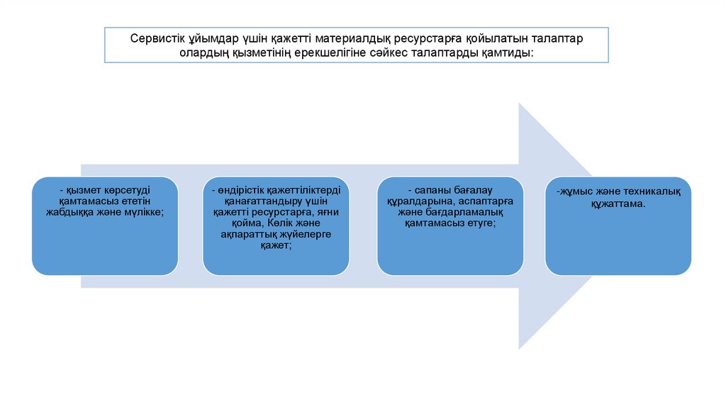 Сервистік ұйымдар үшін қажетті материалдық ресурстарға қойылатын талаптаролардың қызметінің ерекшелігіне сәйкес талаптарды қамтиды: