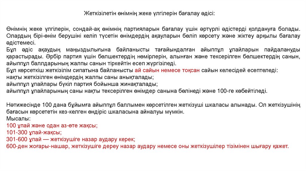 Жеткізілетін өнімнің жеке үлгілерін бағалау әдісі:Өнімнің жеке үлгілерін, сондай-ақ өнімнің партияларын бағалау үшін әртүрлі әдістерді қолдануға болады.