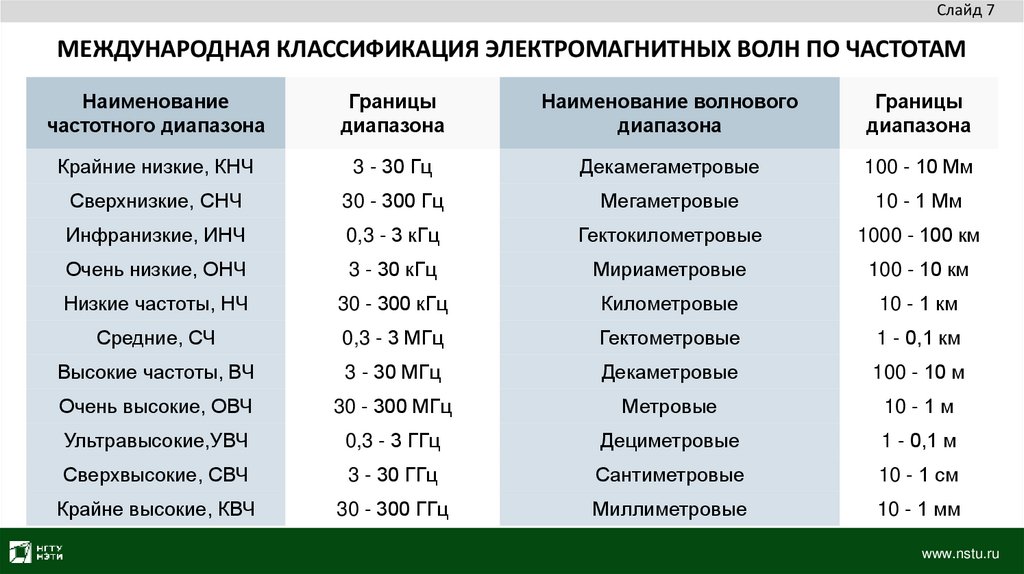 Слайд 7МЕЖДУНАРОДНАЯ КЛАССИФИКАЦИЯ ЭЛЕКТРОМАГНИТНЫХ ВОЛН ПО ЧАСТОТАМ