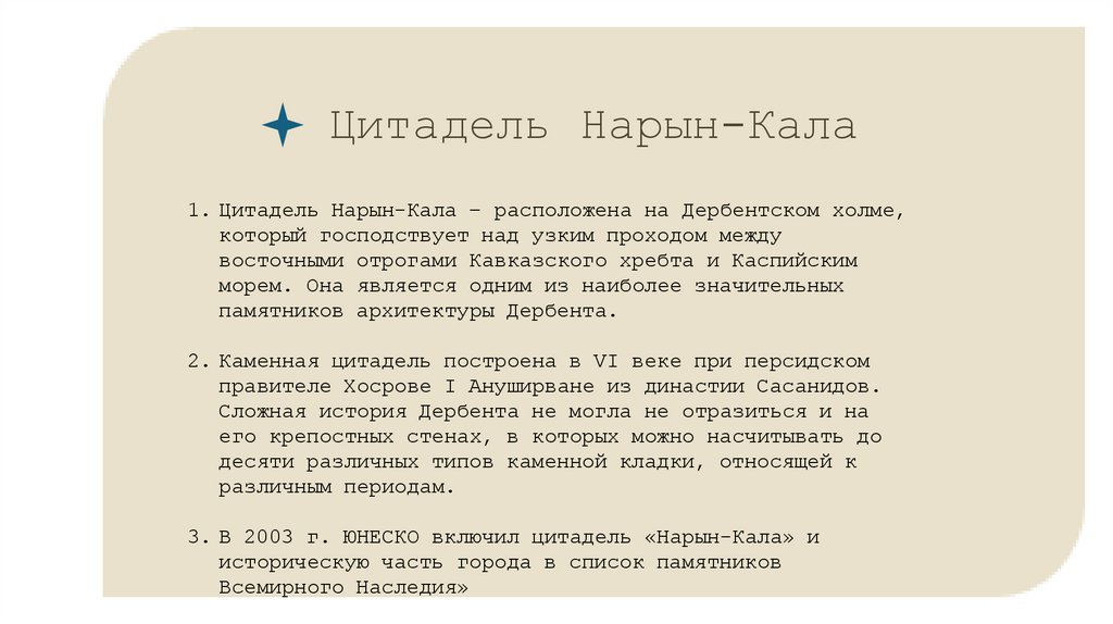3. В 2003 г. ЮНЕСКО включил цитадель «Нарын-Кала» и