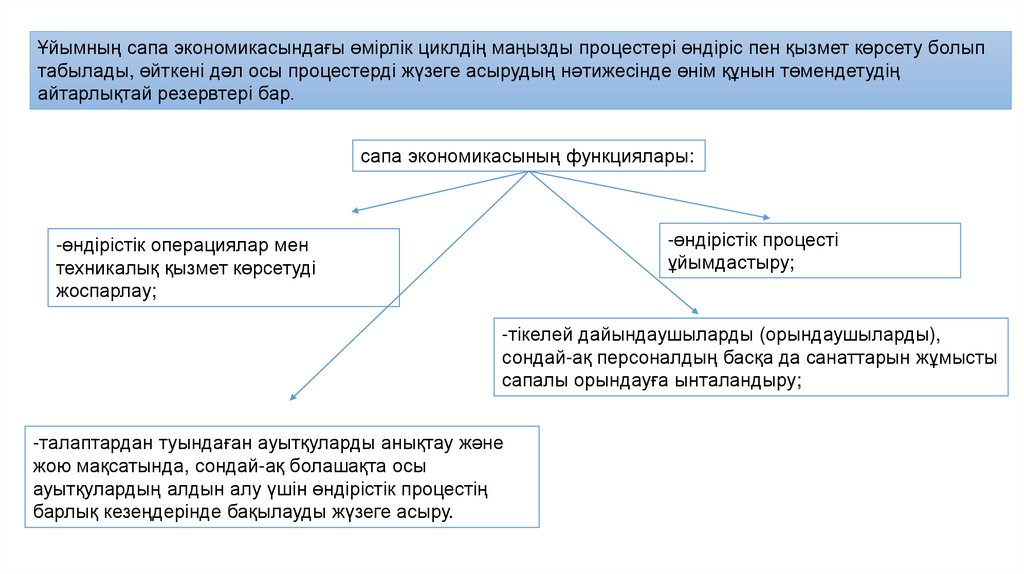 Ұйымның сапа экономикасындағы өмірлік циклдің маңызды процестері өндіріс пен қызмет көрсету болыптабылады, өйткені дәл осы процестерді жүзеге асырудың нәтижесінде өнім құнын төмендетудің