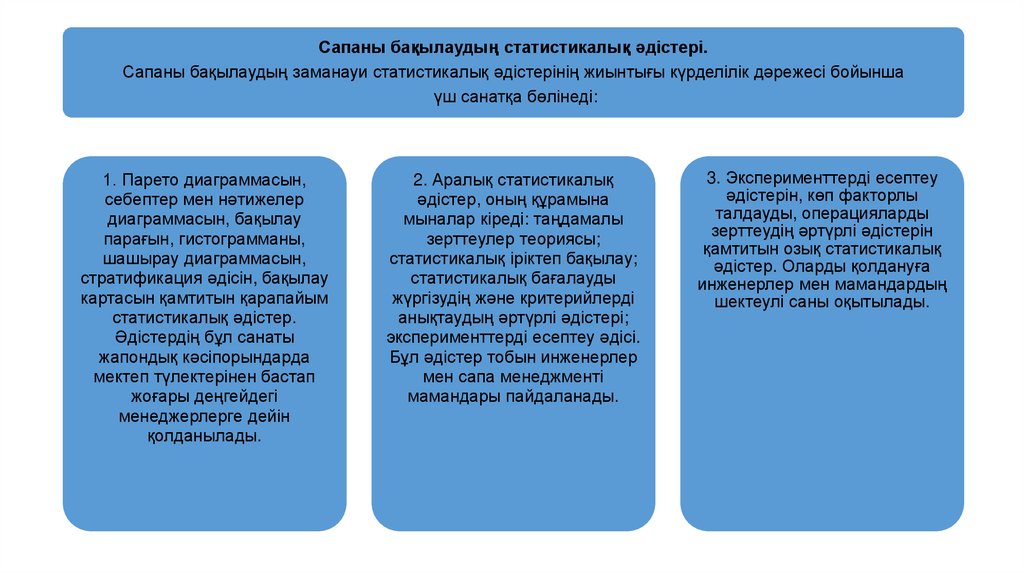 Сапаны бақылаудың статистикалық әдістері.Сапаны бақылаудың заманауи статистикалық әдістерінің жиынтығы күрделілік дәрежесі бойынша