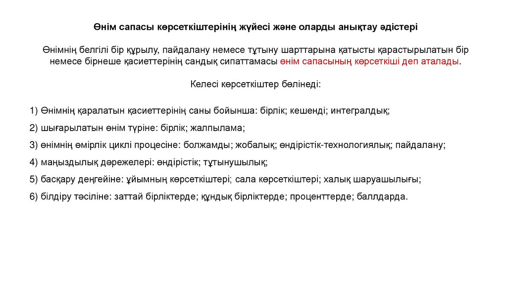 Өнім сапасы көрсеткіштерінің жүйесі және оларды анықтау әдістеріӨнімнің белгілі бір құрылу, пайдалану немесе тұтыну шарттарына қатысты қарастырылатын бір
