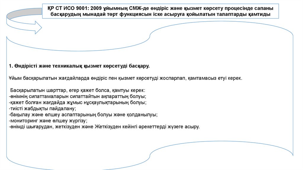 ҚР СТ ИСО 9001: 2009 ұйымның СМЖ-де өндіріс және қызмет көрсету процесінде сапаныбасқарудың мынадай төрт функциясын іске асыруға қойылатын талаптарды қамтиды