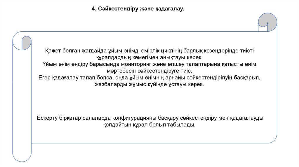 4. Сәйкестендіру және қадағалау.Қажет болған жағдайда ұйым өнімді өмірлік циклінің барлық кезеңдерінде тиісті