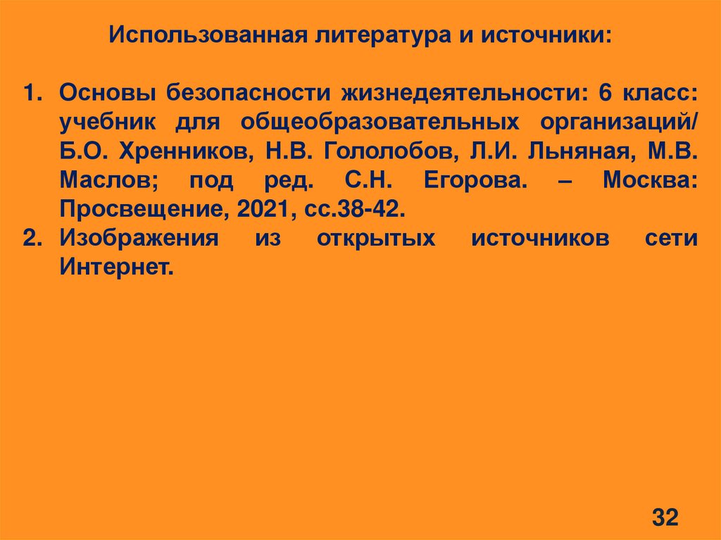 Использованная литература и источники:1. Основы безопасности жизнедеятельности: 6 класс: