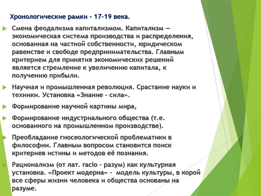Хронологические рамки – 17-19 века.Смена феодализма капитализмом. Капитализм —