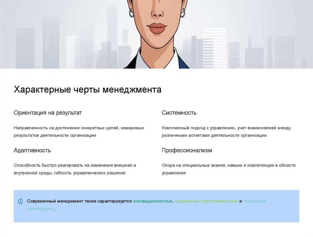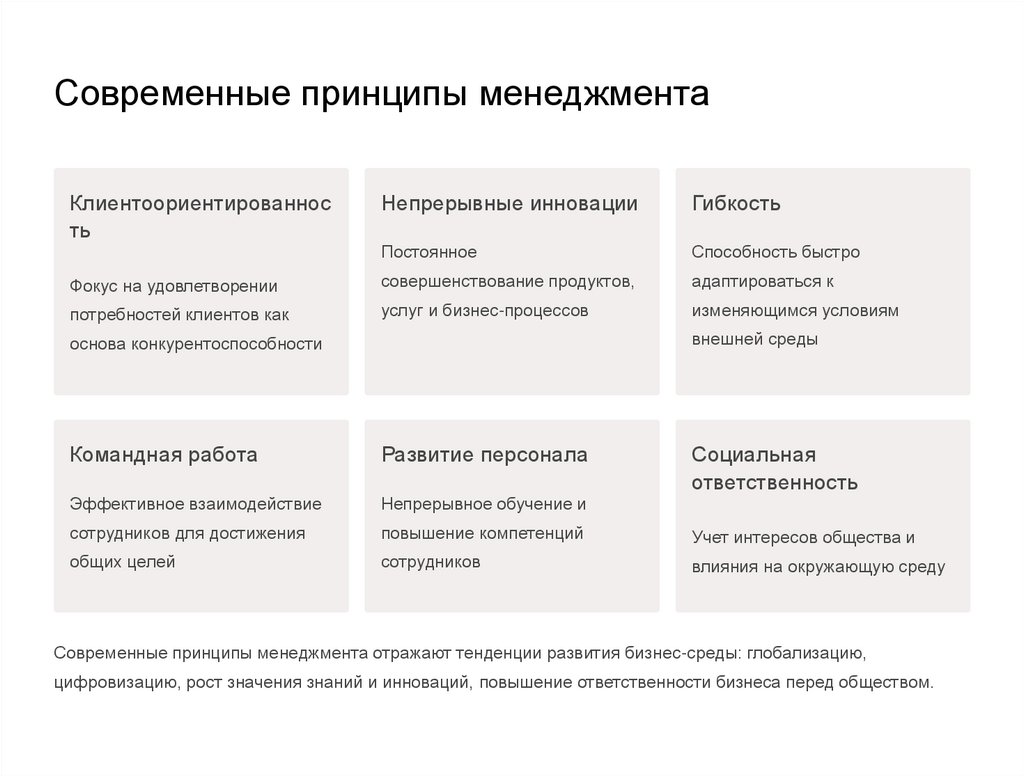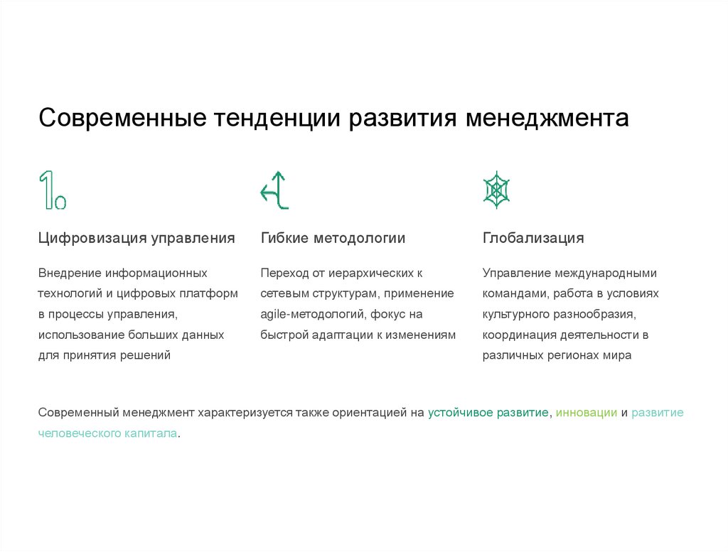 Современный менеджмент характеризуется также ориентацией на устойчивое развитие, инновации и развитие