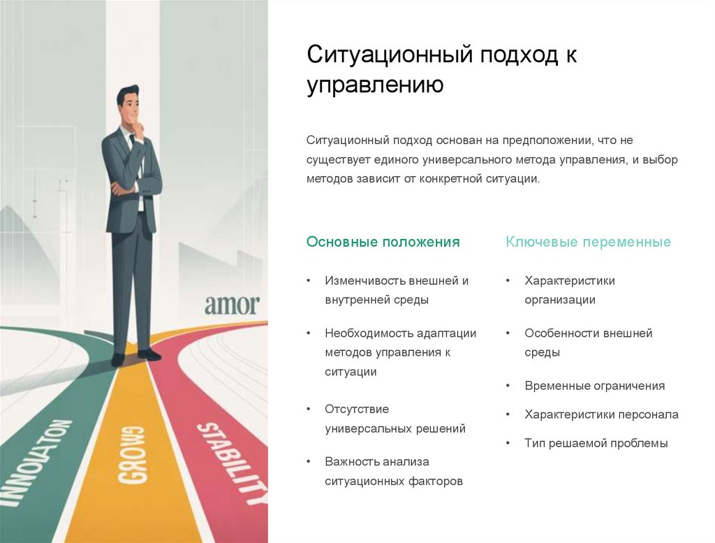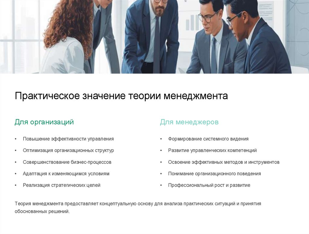 Теория менеджмента предоставляет концептуальную основу для анализа практических ситуаций и принятия