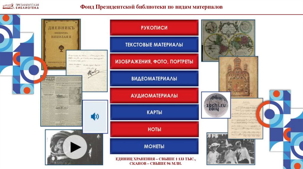 Фонд Президентской библиотеки по видам материаловЕДИНИЦ ХРАНЕНИЯ – СВЫШЕ 1 133 ТЫС.,