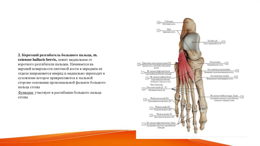 которые прикрепляются к средним фалангам II-V пальцев. Каждое из указанных сухожилий на уровне прокси-мальной фаланги расщепляется на два