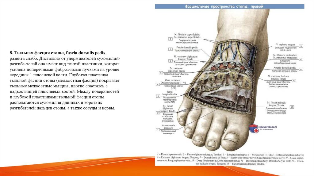 8. Тыльная фасция стопы, fascia dorsalis pedis,развита слабо. Дистально от удерживателей сухожилийразгиба-телей она имеет вид тонкой пластинки, которая