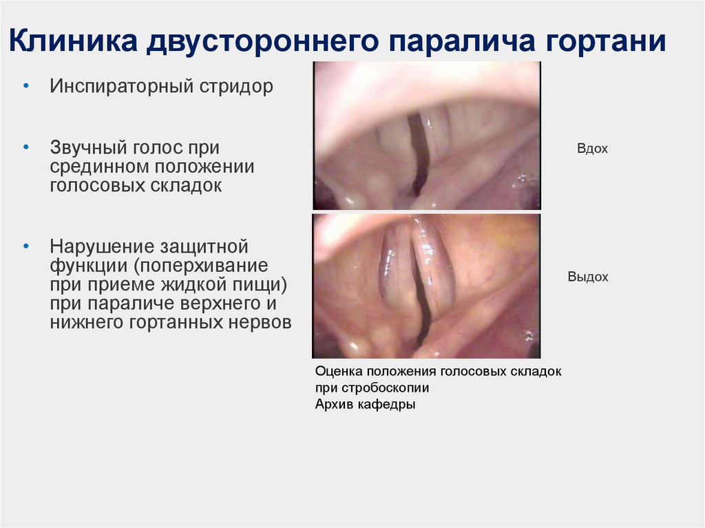 Клиника двустороннего паралича гортани• Инспираторный стридор