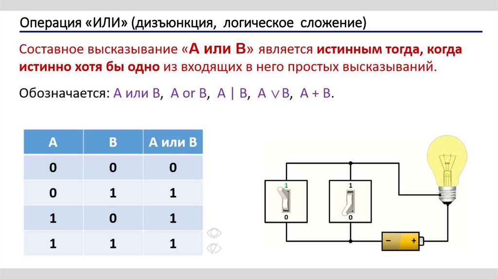 Операция «ИЛИ» (дизъюнкция, логическое сложение)9. Таблицы истинности