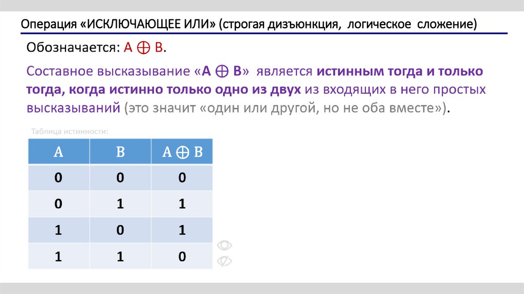 Операция «ИСКЛЮЧАЮЩЕЕ ИЛИ» (строгая дизъюнкция, логическое сложение)11. Импликация (следование, если , то )