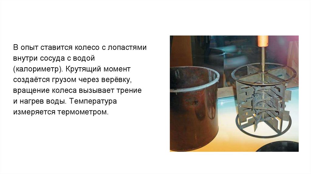 В опыт ставится колесо с лопастямивнутри сосуда с водой