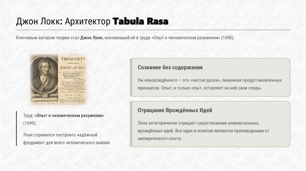 Джон Локк: Архитектор Tabula RasaКлючевым автором теории стал Джон Локк, изложивший её в труде «Опыт о человеческом разумении» (1690).