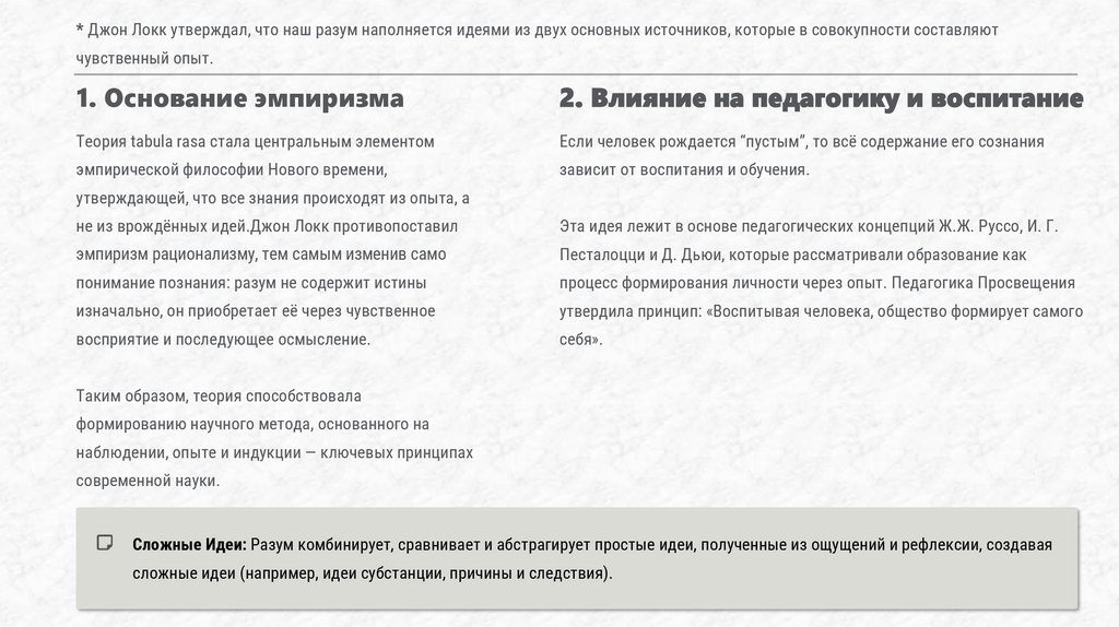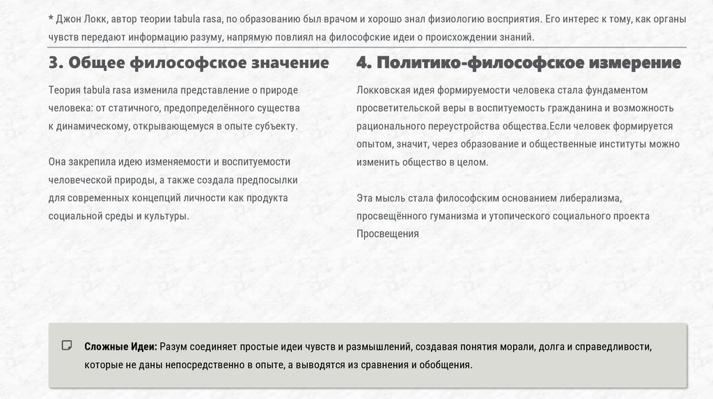 * Джон Локк, автор теории tabula rasa, по образованию был врачом и хорошо знал физиологию восприятия. Его интерес к тому, как органычувств передают информацию разуму, напрямую повлиял на философские идеи о происхождении знаний.