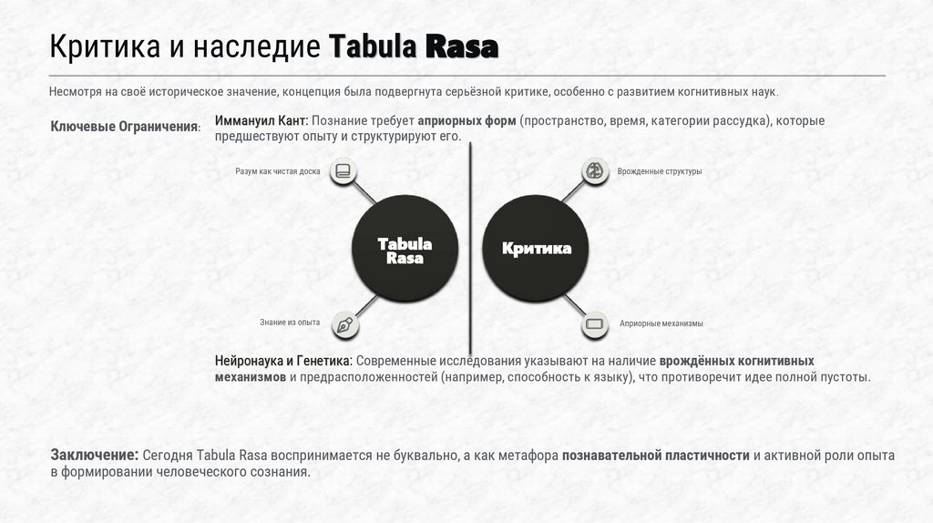 Заключение: Сегодня Tabula Rasa воспринимается не буквально, а как метафора познавательной пластичности и активной роли опыта