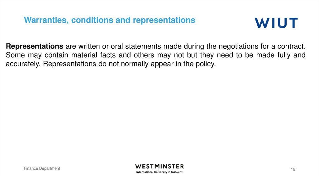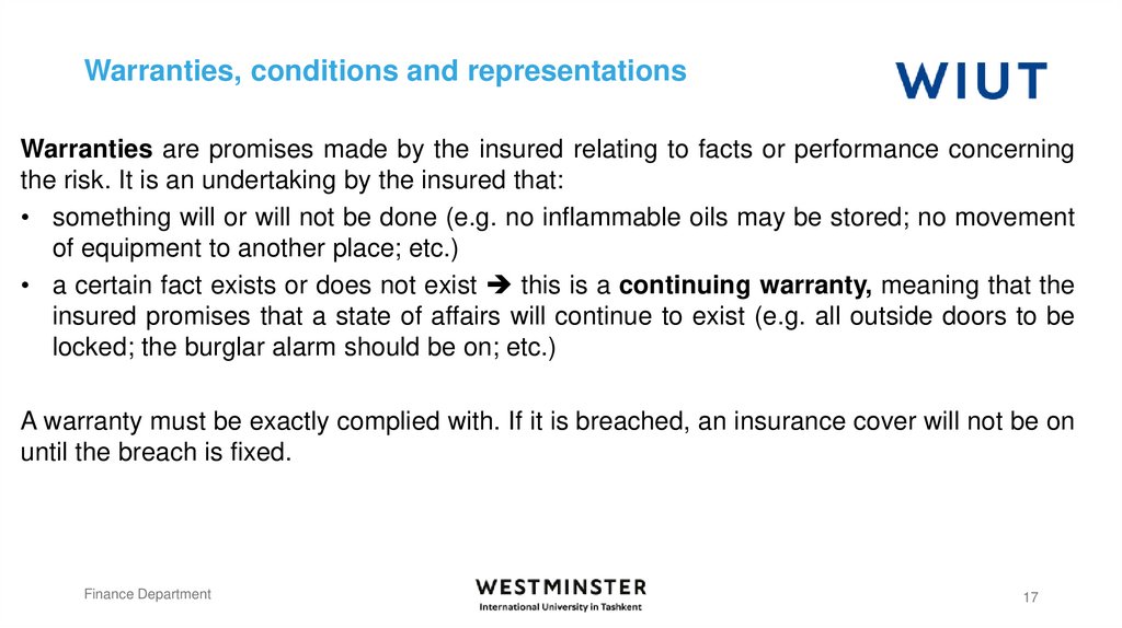 Warranties, conditions and representationsWarranties are promises made by the insured relating to facts or performance concerning