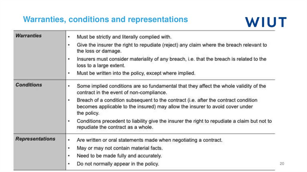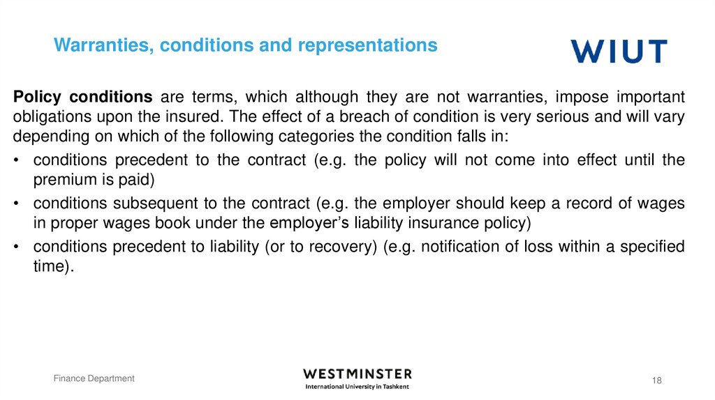 Warranties, conditions and representationsPolicy conditions are terms, which although they are not warranties, impose important