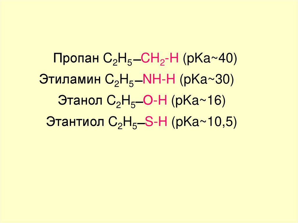 Пропан C2H5 ̶ CH2-H (pKa~40)Этиламин C2H5 ̶ NH-H (pKa~30)