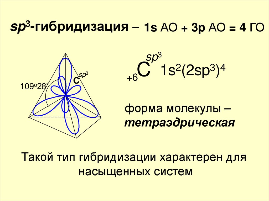 sp3-гибридизация – 1s АО + 3p АО = 4 ГОsp3