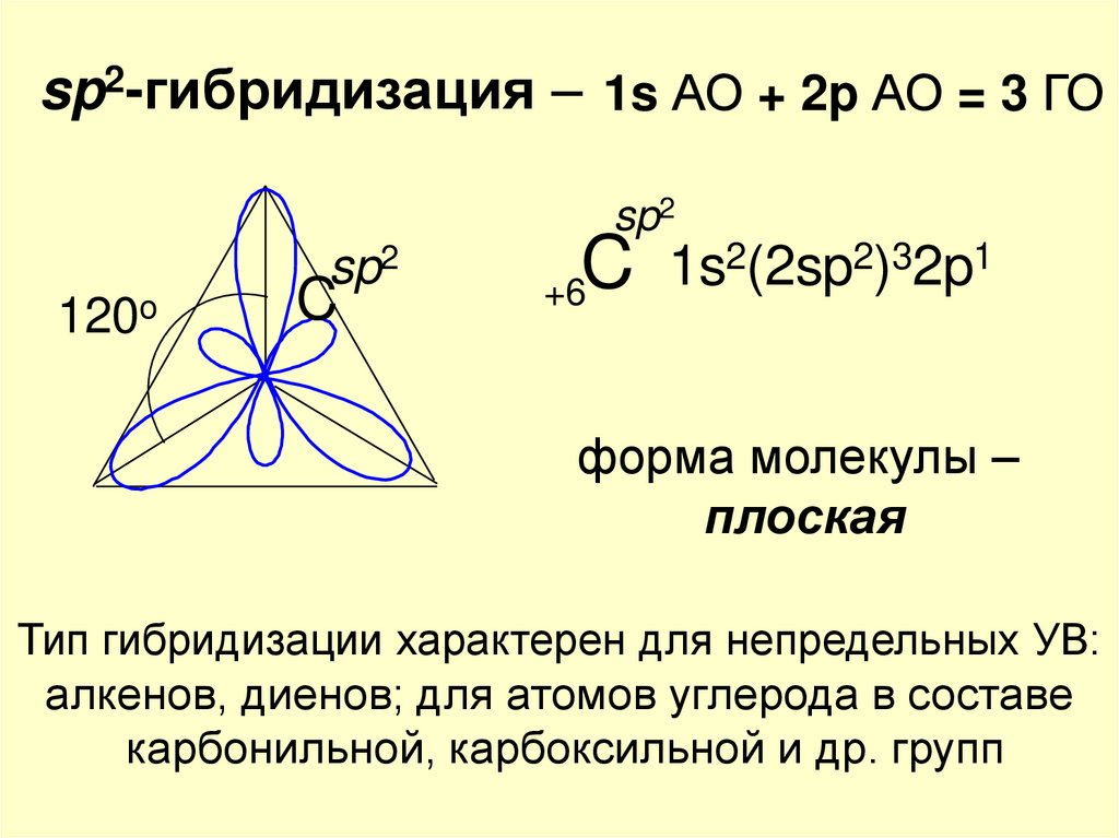sp2-гибридизация – 1s АО + 2p АО = 3 ГОsp2