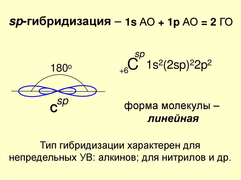 sp-гибридизация – 1s АО + 1p АО = 2 ГОsp