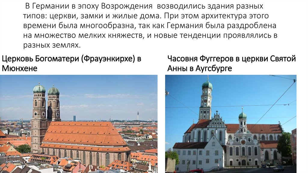 В Германии в эпоху Возрождения возводились здания разныхтипов: церкви, замки и жилые дома. При этом архитектура этого