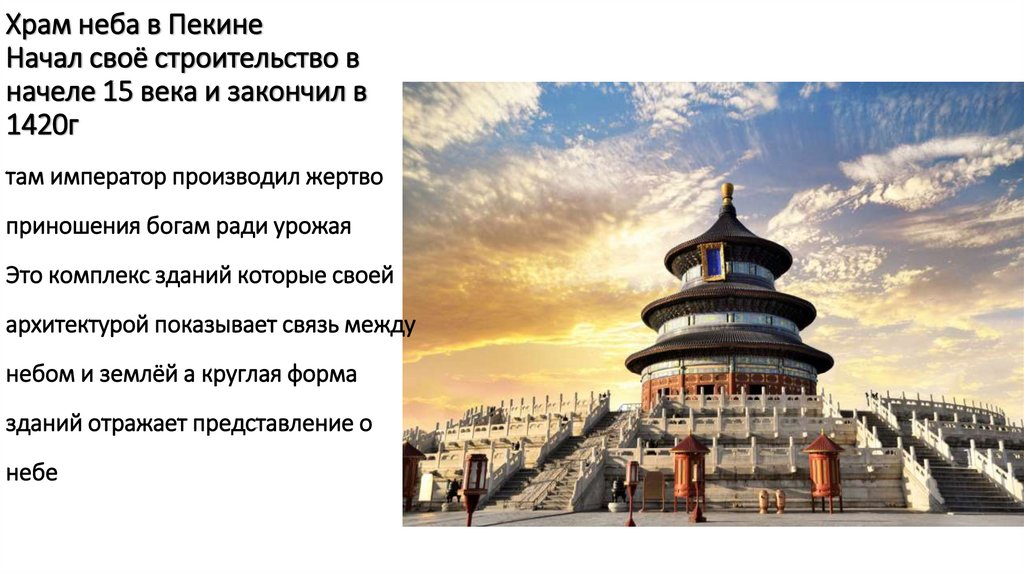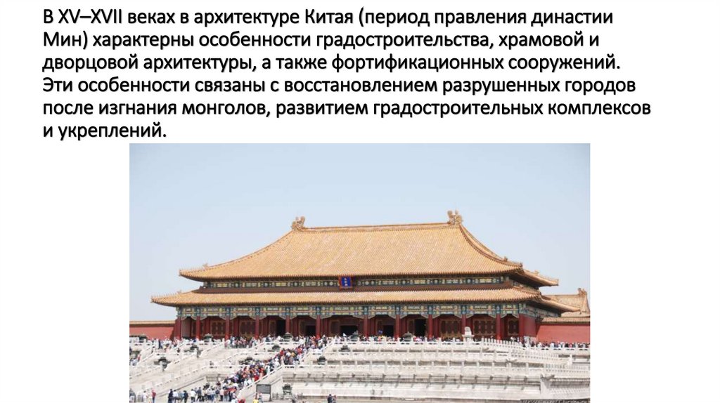 В XV–XVII веках в архитектуре Китая (период правления династииМин) характерны особенности градостроительства, храмовой и