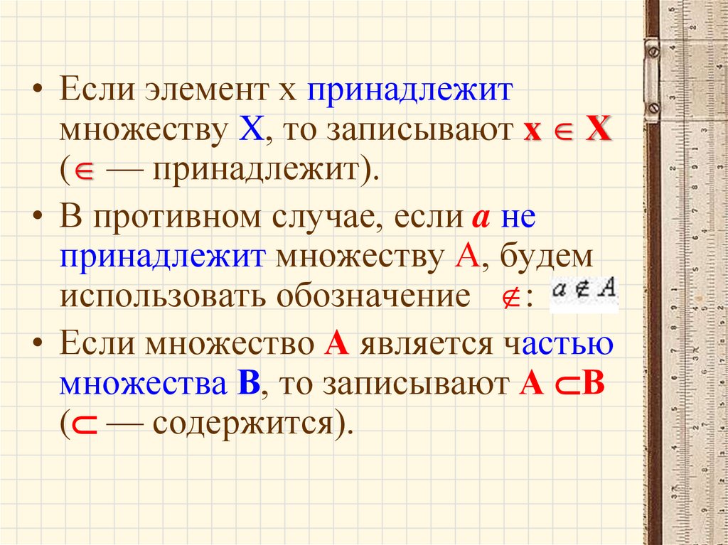 • Если элемент x принадлежитмножеству X, то записывают x Х