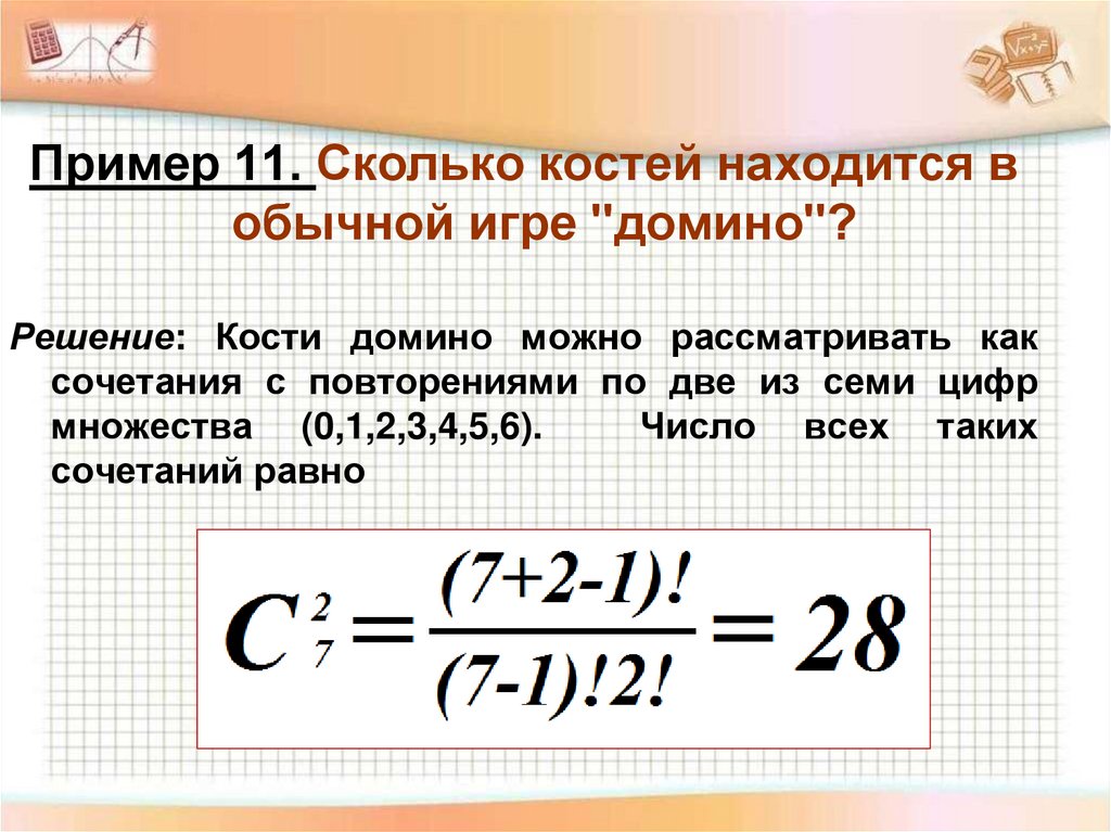 Пример 11. Сколько костей находится вобычной игре "домино"?