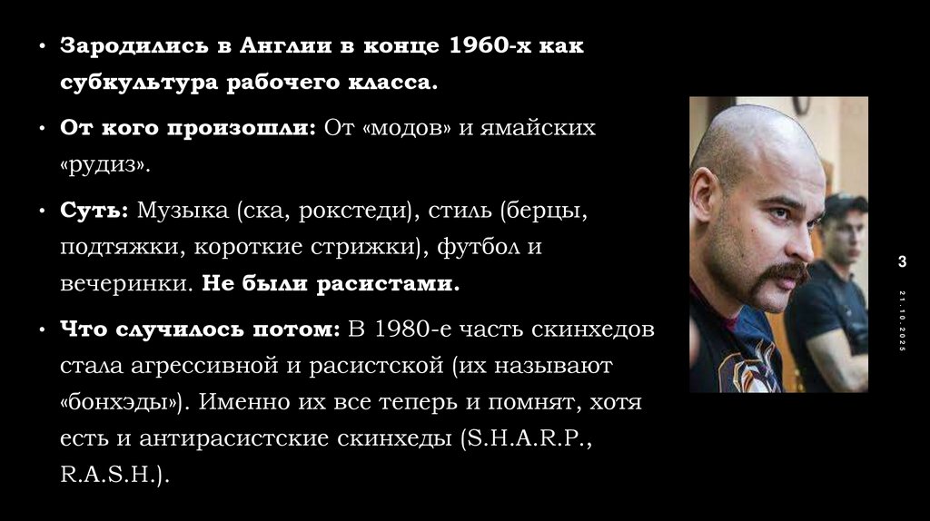 КТО ЭТО?• Скинхеды — это представители молодёжной субкультуры,