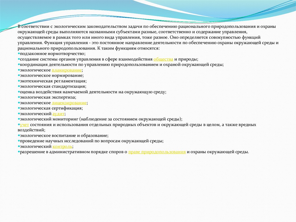 В соответствии с экологическим законодательством задачи по обеспечению рационального природопользования и охраныокружающей среды выполняются названными субъектами разные, соответственно и содержание управления,