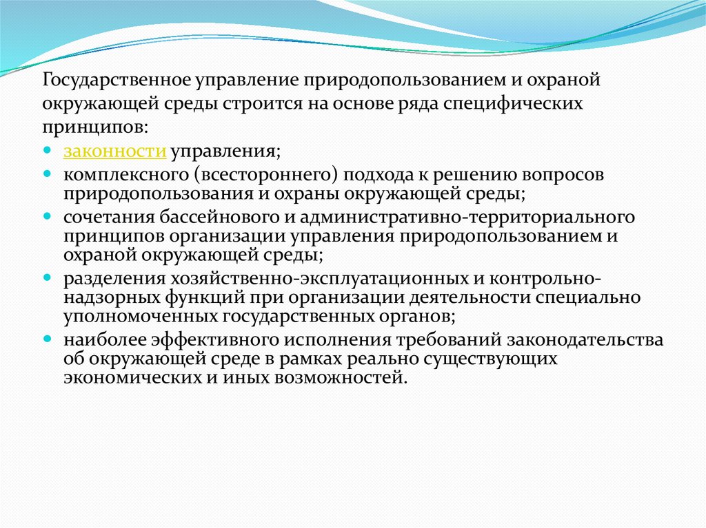 Государственное управление природопользованием и охранойокружающей среды строится на основе ряда специфических
