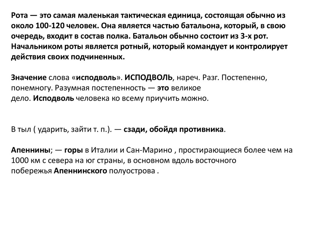 Рота — это самая маленькая тактическая единица, состоящая обычно изоколо 100-120 человек. Она является частью батальона, который, в свою