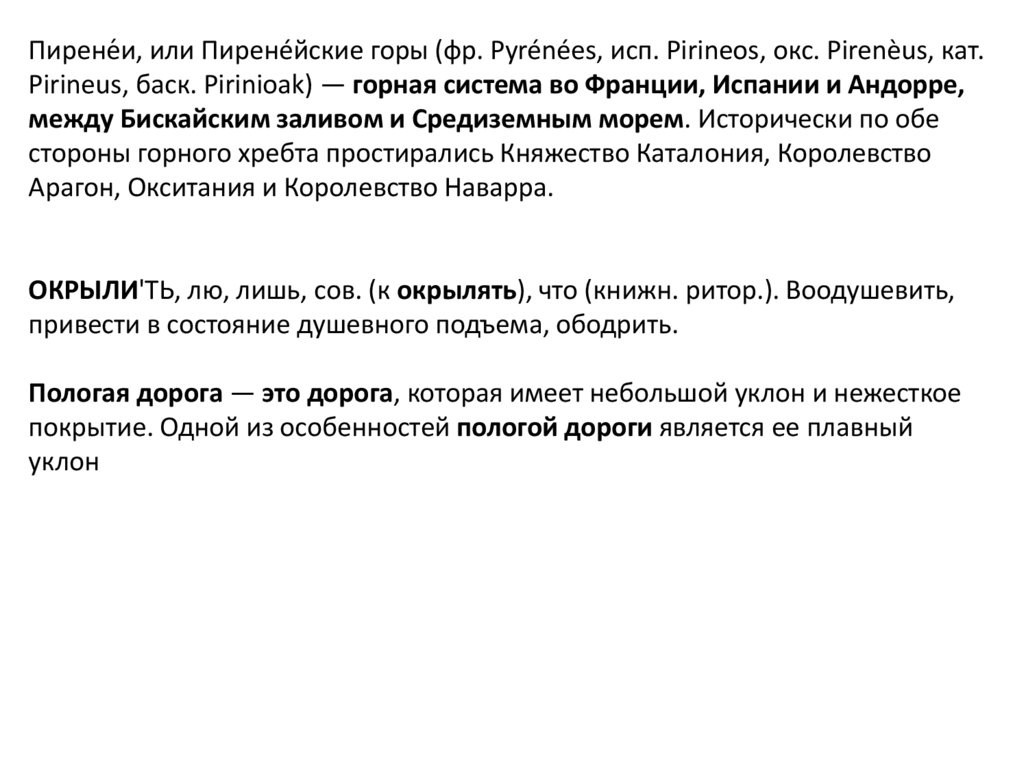 Пирене́и, или Пиренéйские горы (фр. Pyrénées, исп. Pirineos, окс. Pirenèus, кат.Pirineus, баск. Pirinioak) — горная система во Франции, Испании и Андорре,