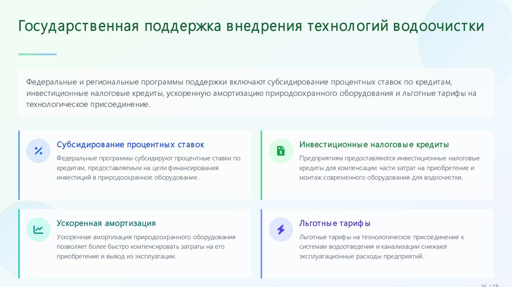 Государственная поддержка внедрения тех нологий водоочисткиФедеральные и региональные программы поддержки включают субсидирование процентных ставок по кредитам,