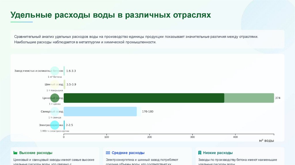 Удельные расходы воды в различных отрасляхСравнительный анализ удельных расходов воды на производство единицы продукции показывает значительные различия между отраслями.