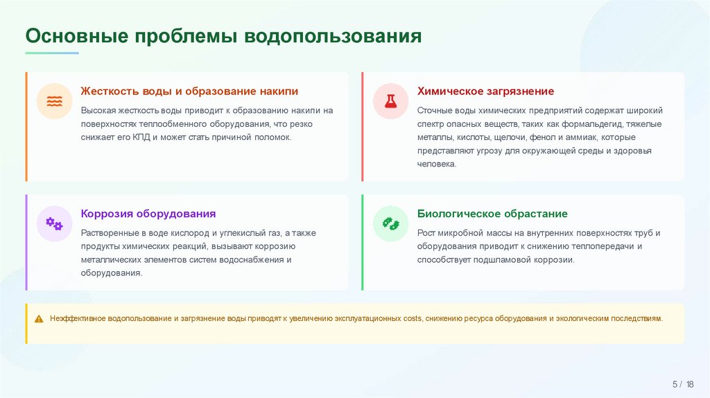 Неэффективное водопользование и загрязнение воды приводят к увеличению эксплуатационных costs, снижению ресурса оборудования и экологическим последствиям.