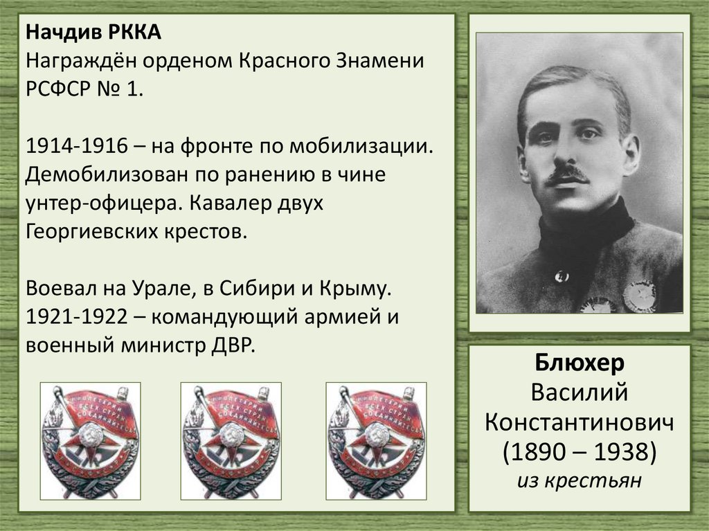 1. Начдив РККА Награждён орденом Красного Знамени РСФСР № 1. 1914-1916 – на фронте по мобилизации. Демобилизован по ранению в чине